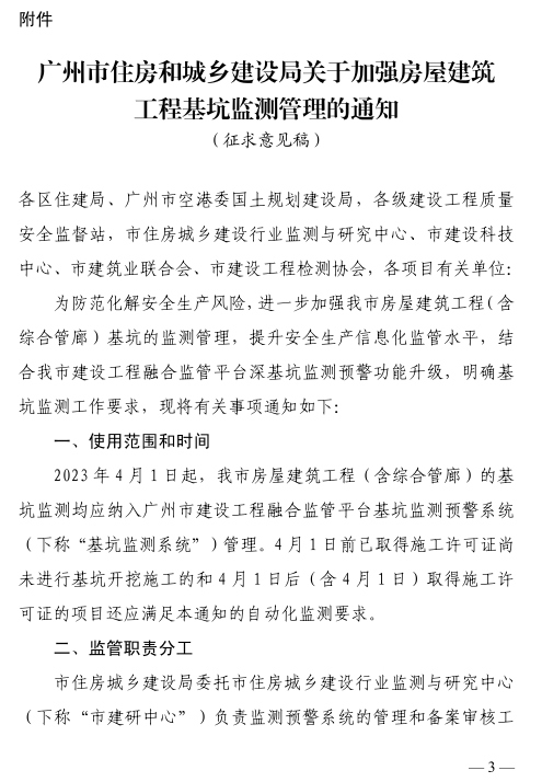 廣州市住房和城鄉(xiāng)建設(shè)局關(guān)于征求《加強(qiáng)房屋建筑工程基坑監(jiān)測管理的通知》意見的函